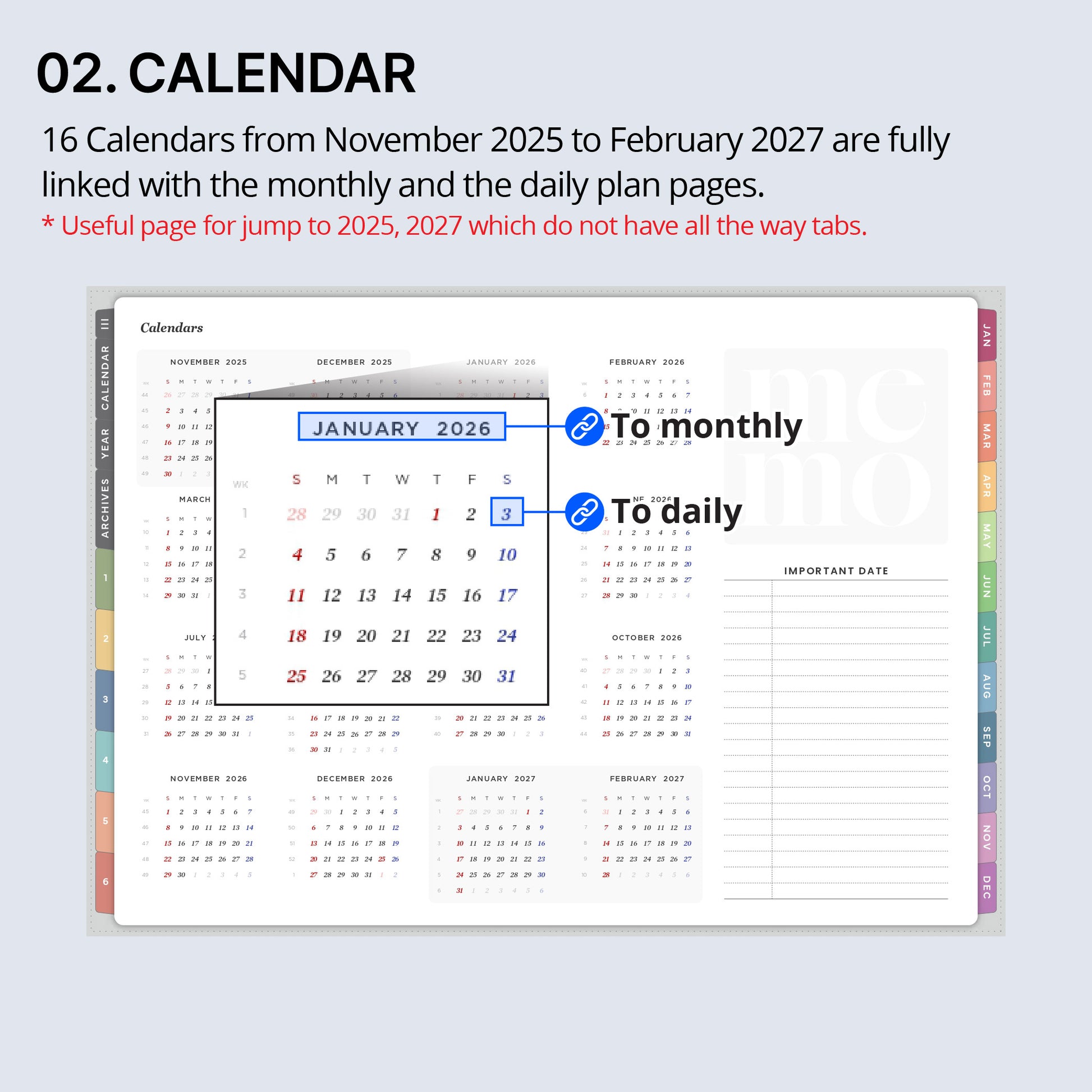 Since the Every-day planners include pre-dated pages, it can only be used from November 2025 to February 2027. To accommodate customers from various countries, only New Year's Day and Christmas are marked in red by default.