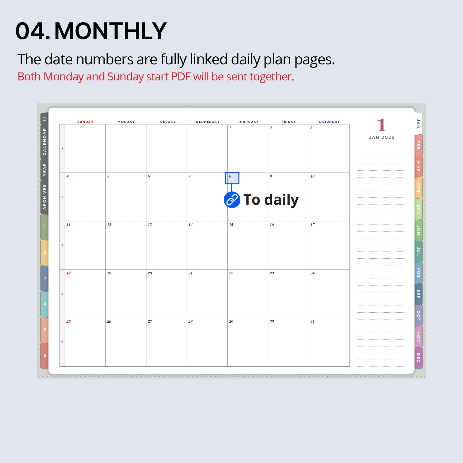 This is a digital product (not a physical diary) that allows you to organize your monthly+daily plans in one notebook.